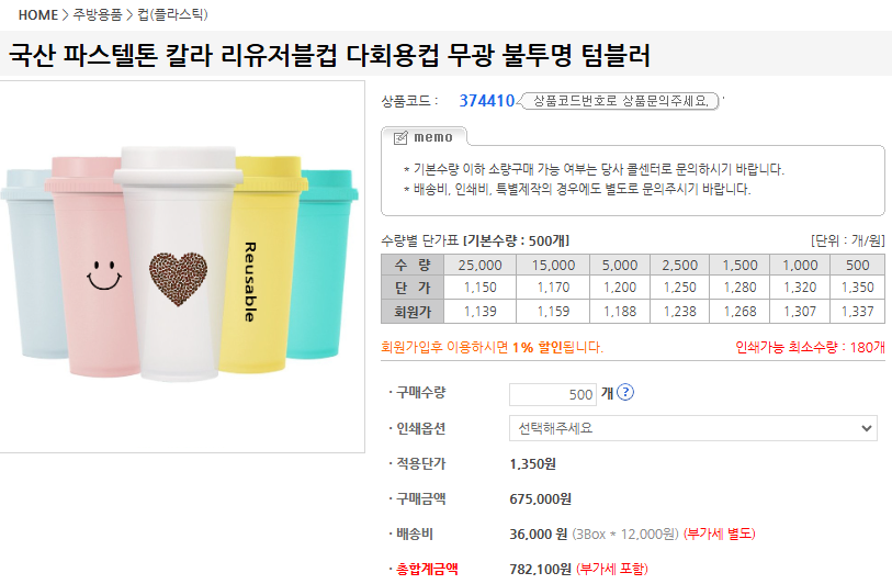 | 파스텔 텀블러/리유저블컵 | 개당 1400~2000원 | 전사인쇄 풀컬러 840원 | 개당 1320원 |