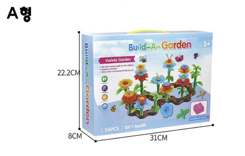 - 54pcs의 풍성한 구성: 바닥과 줄기, 꽃을 자유롭게 꽂으며 나만의 정원을 완성해가는 과정에서 소근육 발달은 물론 창의력까지 쑥쑥 자라납니다. 3세 이상이라면 누구나 높은 완성도의 가든을 만들 수 있어요.